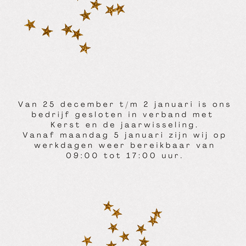 Van 25 december tot en met 2 januari is ons bedrijf gesloten in verband met Kerst en de jaarwisseling.